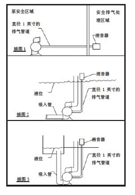 如果泵的材料與所吸液體間不會反應,則可將其浸入所輸送的液體中。排氣口必須在液位上方用管連接。建議采用排氣管徑不小于1 英寸的管道,管道過小將會對氣流流量和泵的性能造成限制。見插圖2